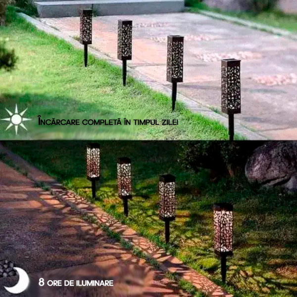 Lumina solară funcționează automat prin încărcarea cu energie solară în timpul zilei și strălucește mai mult de 8 ore pe timp de noapte!