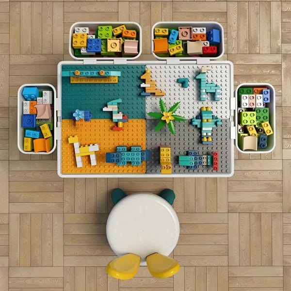 Masa este utilizabilă pe ambele părți, cu o parte proiectată pentru asamblarea cuburilor și cealaltă având o suprafață plană.