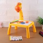 Un proiector colorat cu tematică de girafă, conceput pentru a atrage atenția și a fi amuzant pentru copii, stimulând dezvoltarea motrică și cognitivă.