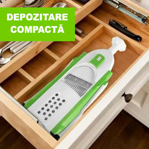 Designul pliabil economisește spațiu, făcându-l perfect pentru orice dimensiune a bucătăriei. De asemenea, vă permite să preparați rapid și în siguranță fructe și legume în diferite forme!